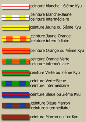 L’élève démarre en ceinture blanche. Au terme de l’acquisition des compétences nécessaires à l’obtention du niveau suivant, l’élève passera un examen en vue de l’obtention de son prochain grade. Cet examen est divisé en modules…Jusqu’à la noire 1er dan incluse, l’examen se passe au sein du club. Le passage à la ceinture noire 2ème Dan et supérieurs, aura lieu dans un centre d’examen départemental.